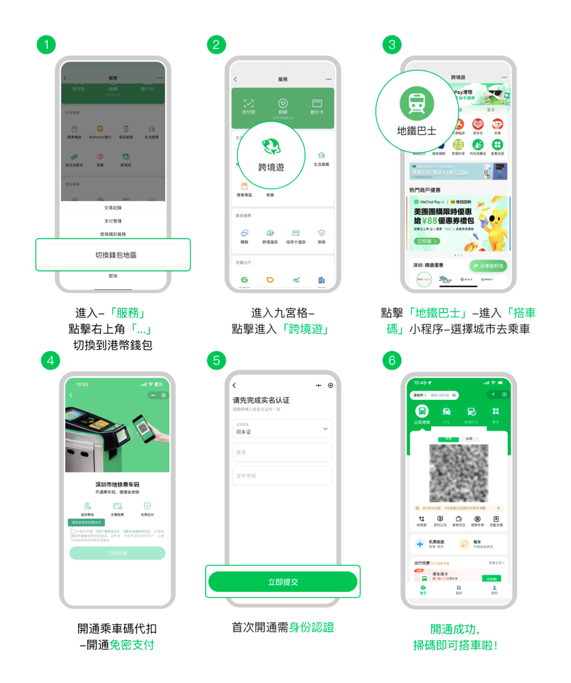 用户通过微信香港钱包的“跨境游”专区,可选择开通相应城市的公交或地铁乘车码,便捷扫码乘车,无需排队购票,车费将以优惠汇率结算。香港用户通过香港手机号注册微信或WeChat,开通微信支付港币钱包WeChat Pay HK,即可通过钱包余额、绑定的香港信用卡或银行账户在内地数千万商户便捷支付。